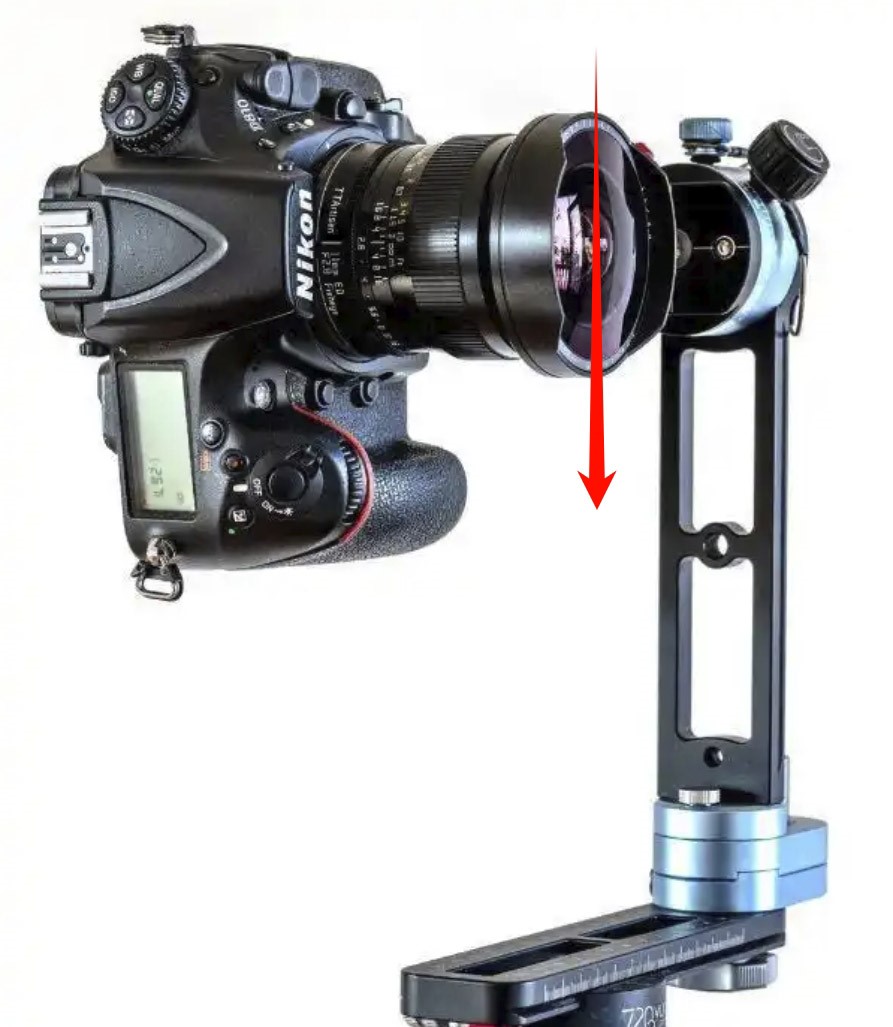 在我们进行嘉兴VR全景拍摄的过程中,除了部分要求不高的使用VR全景相机外,嘉兴专业的都是用专业相机,我们在使用专业相机的时候,必不可少的就是VR云台,在长时期用过VR云台的人我想都会遇到一个相当无语的问题:拍摄过程中会出现相像镜头向正下文下垂,如下图箭头方向下垂。